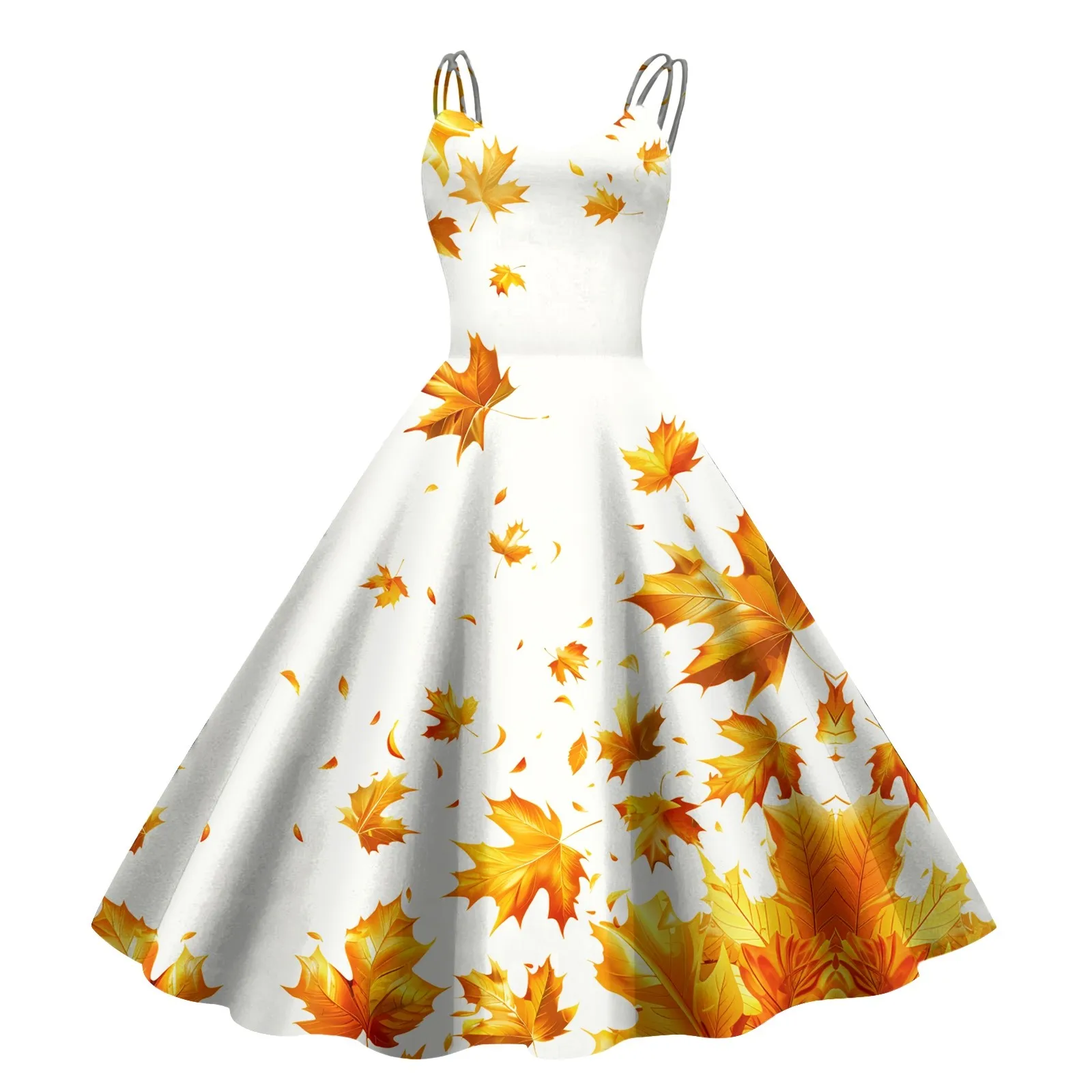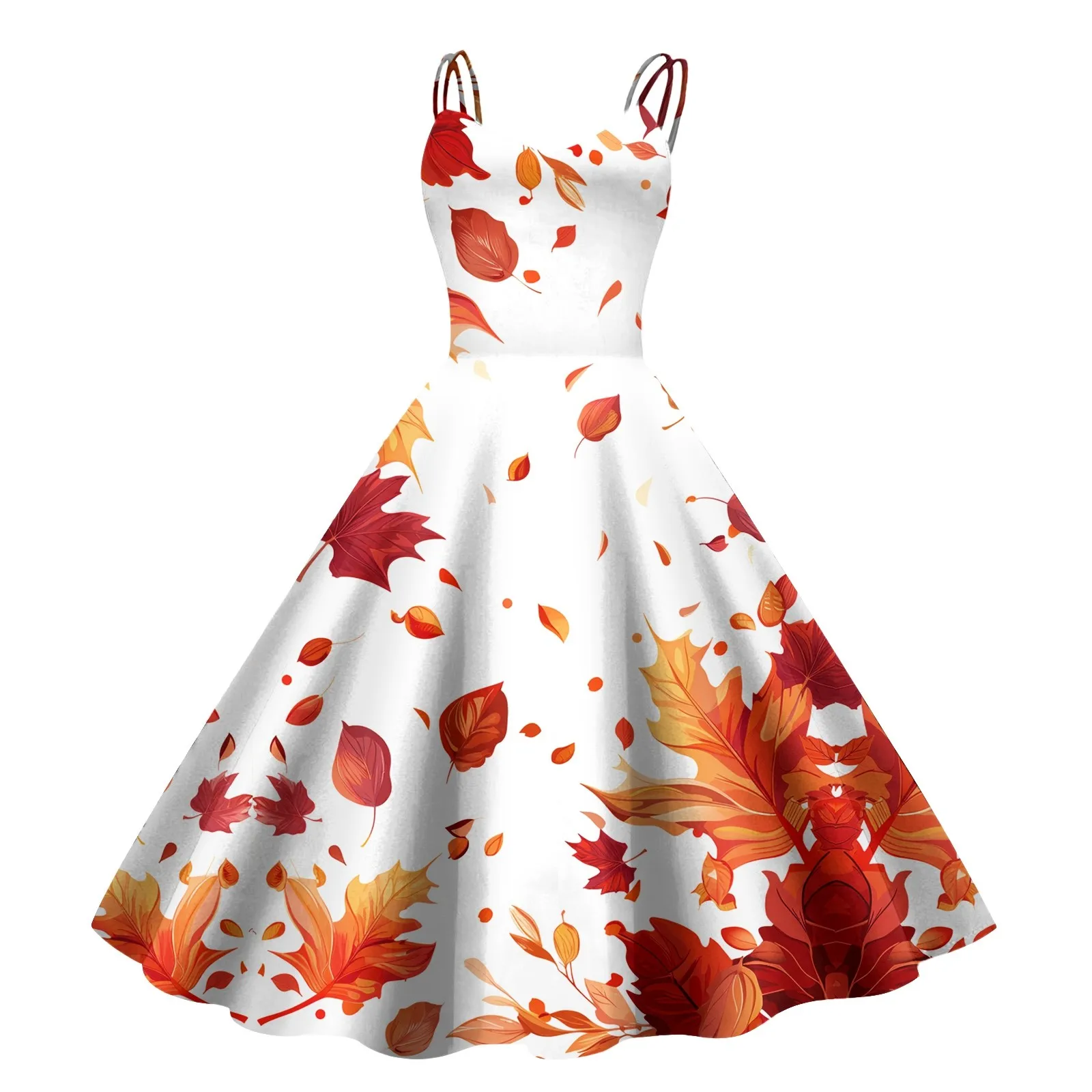 Women's Fashionable Thanksgiving Printed Strap Zipper Casual Retro Long Dress (4)